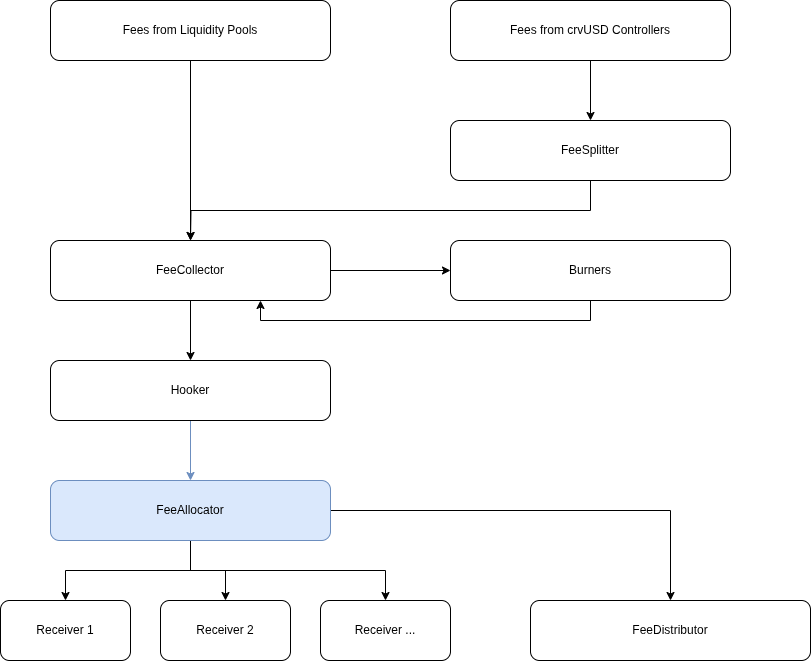 The FeeAllocator contract acts as an intermediary between the Hooker and FeeDistributor, splitting incoming crvUSD fees according to configured weights. The contract caps non-veCRV allocations at 50% and supports up to 10 receivers. Funds sent to the community fund remain under DAO control with a 1-year vesting period for any subsequent allocation.