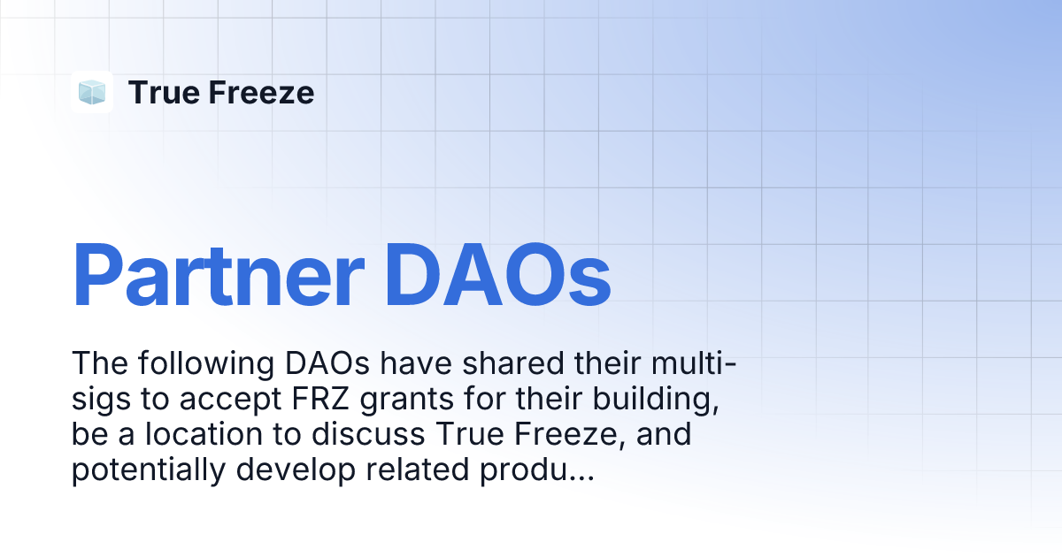 A number of DAOs have agreed to accept significant shares of the initial supply of the FRZ token for monitoring of the protocol including education, analytics, low fee NFT marketplace, etc. Acceptance of this FRZ is not an endorsement of the safety of the protocol. Everything is 100% immutable and Deep Freeze LLC seeks to empty itself entirely of FRZ ASAP. There are 5.3M left to send to Partner DAOs. 4.7M outstanding to angel DAOs, and 20M pending approval of liquidity pool rewards. See Docs for more details.
