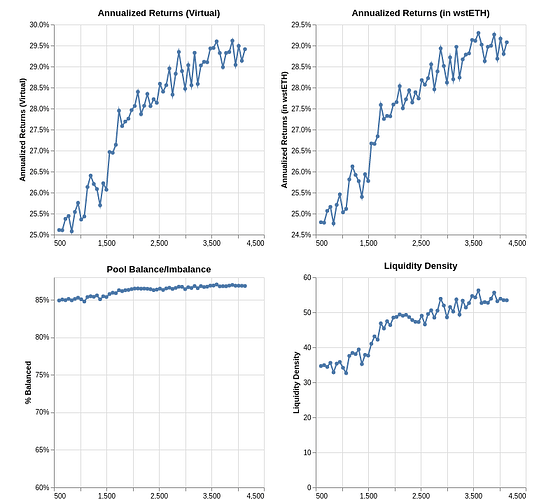 Simulating the lower-right, high-volume region with finer resolution, we found a region that seemed to optimize best the trade-offs between returns (est. ~15% annualized), liquidity density (median ~28), volume (~11k ETH for full simulation period) and pool balance (median deviation 7 percentage points from optimal 33/33/33 split). Mean fee was 4.6 bps, slightly higher than our target. However, closer inspection revealed that most trades had a fee < 4bps, and a few large outliers dragged the average fee up. Therefore, we ruled the fee range to be acceptable.