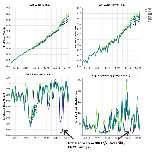 The proposed parameters are designed to reduce trading fees and increase liquidity density (i.e., reduce slippage). Currently, the pool’s fee parameters are overly sensitive to pool imbalance, resulting in uncompetitive fees. For example, the pool currently has a fee of 40 bps (10x the target fee range) with only moderate imbalance. We simulated a range of parameters expected to produce average fees on the order of 3-4 bps and compared their performance.