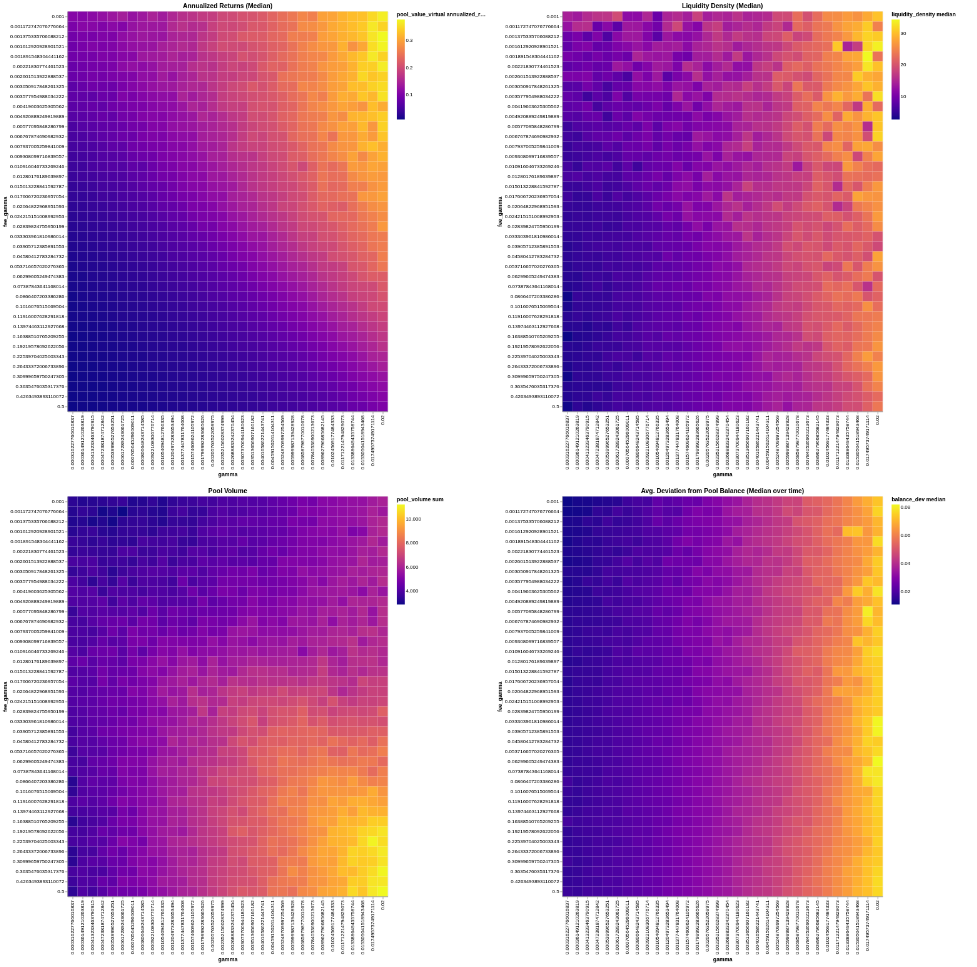 We compared annualized returns, liquidity density, trading volume, and pool balance for each gamma/fee_gamma combination.