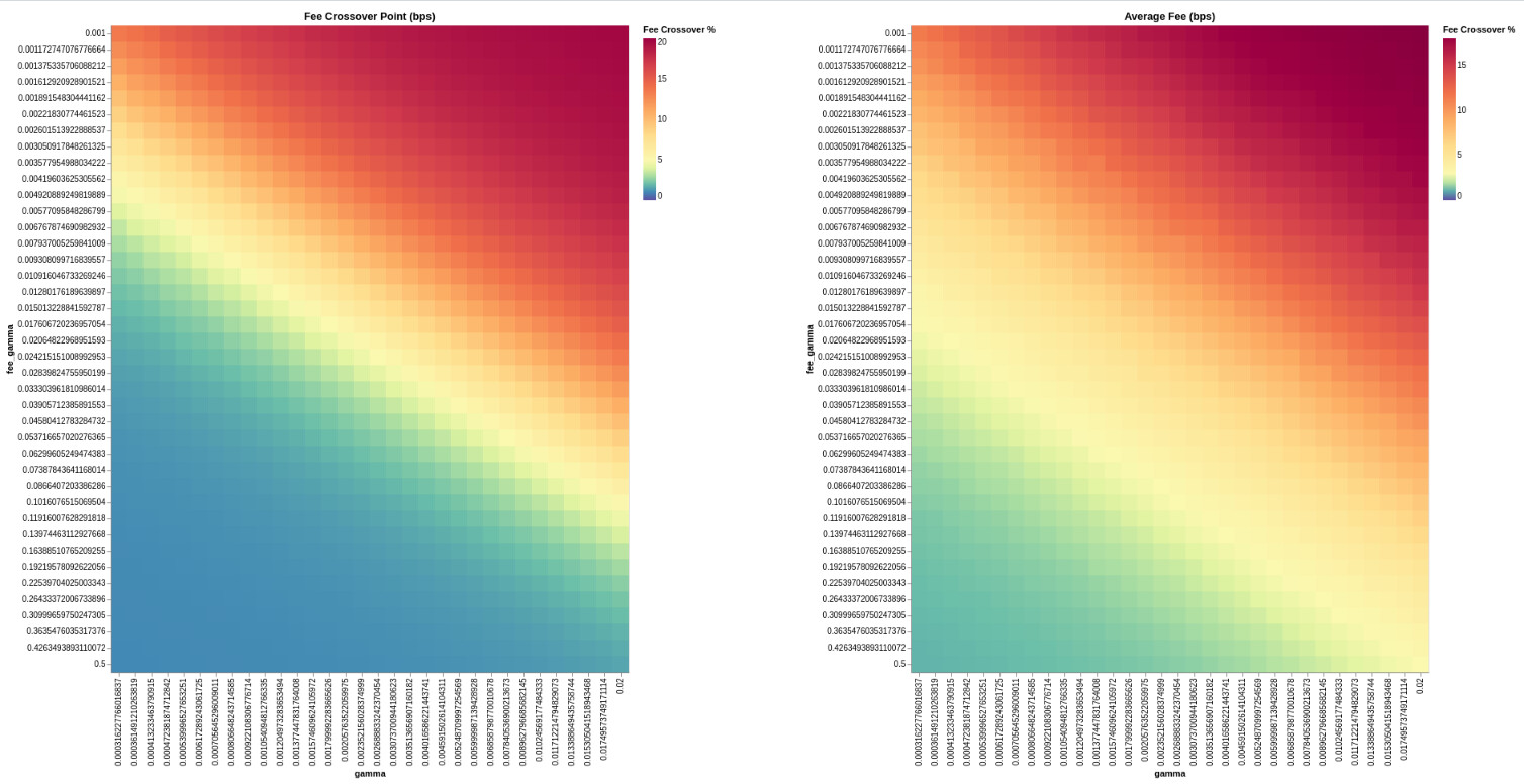 Because this resulted in poor trading experience and high fees the majority of the time, we ruled out these parameters and focused on the lower-right corner (high gamma, high fee gamma), where average fees were far lower (2-7 bps), and volume was approximately doubled.