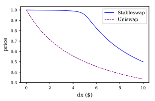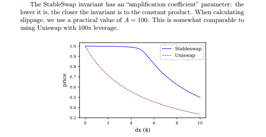 Higher A means the top blue part is flatter. The higher A will allow larger txns without having slippage. The downside of higher A is that if a token goes off peg, you might end up with a very small or large proportion of that token in the pool. This happened in the y pool (A was 2000), where DAI broke its peg upwards, and it only made up about 2-3% of the pool proportion. But if you trust the tokens to maintain their intended peg, higher A attracts more trading volume as there is a wider optimal range where there is basically no slippage