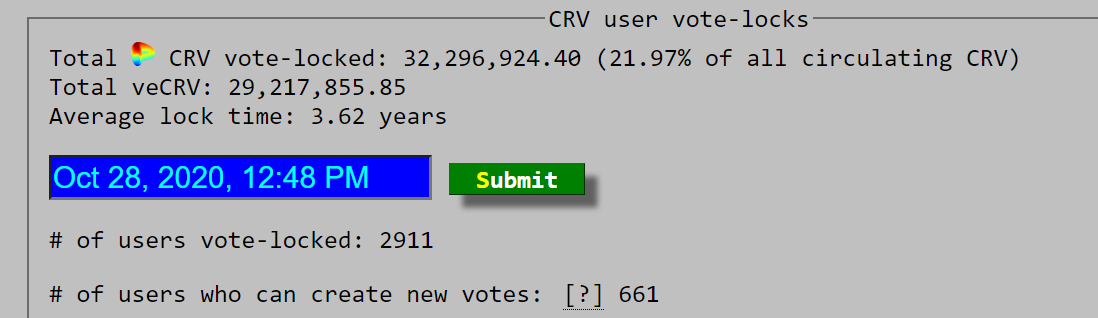 I see 2911 users who have locked their CRV and 661 who have more than the 2500 veCRV required to submit a proposal.