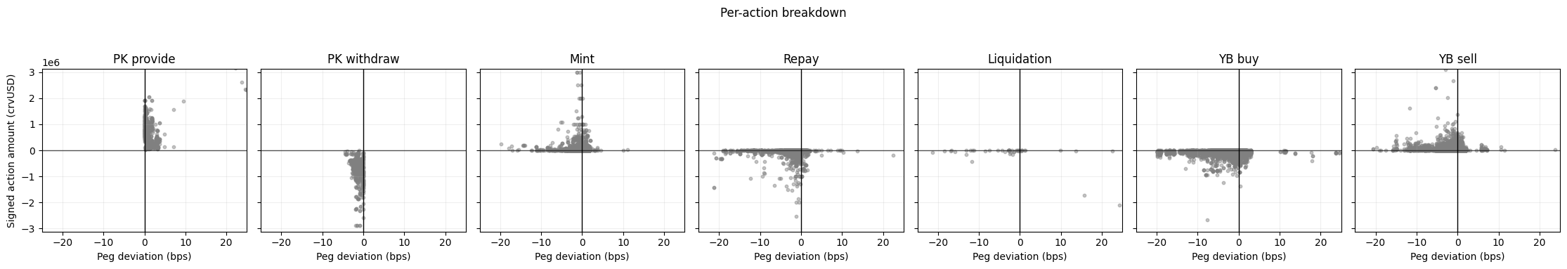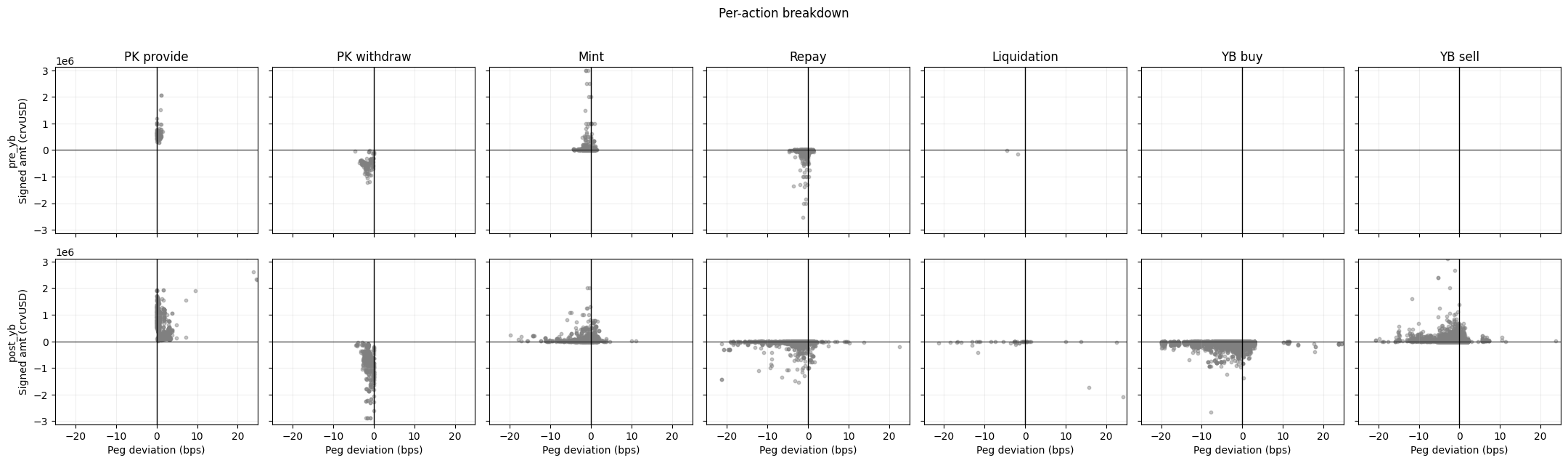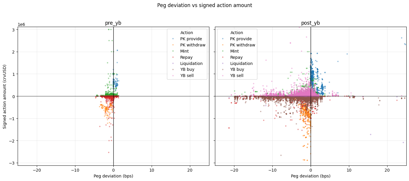 Post-YB, all PegKeeper and mint actions are more dispersed, reflecting greater crvUSD system stressors. Mint actions seem at times directionally undesirable. However, they are low in size as the peg deviation turns more negative. Only YB sell actions are additive, showing undesirable behaviour.