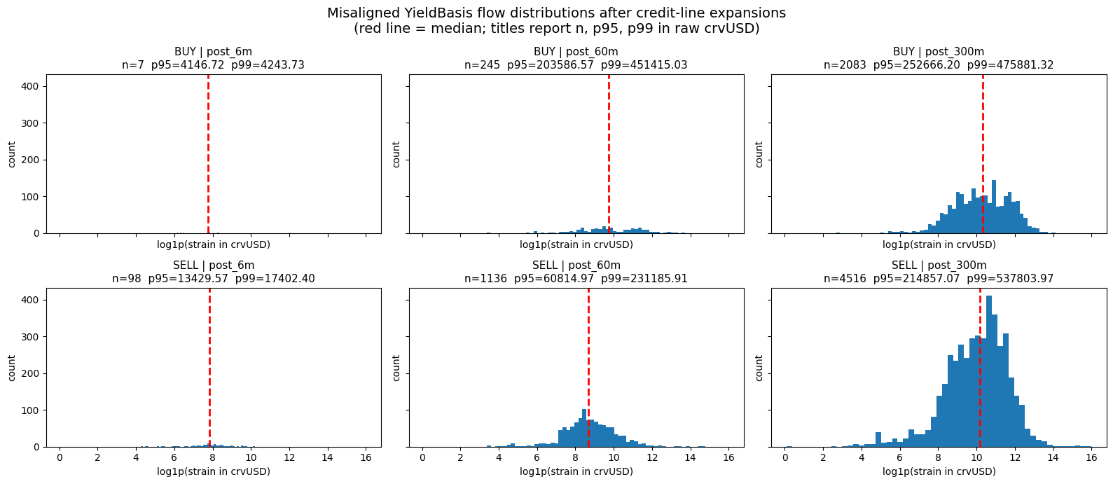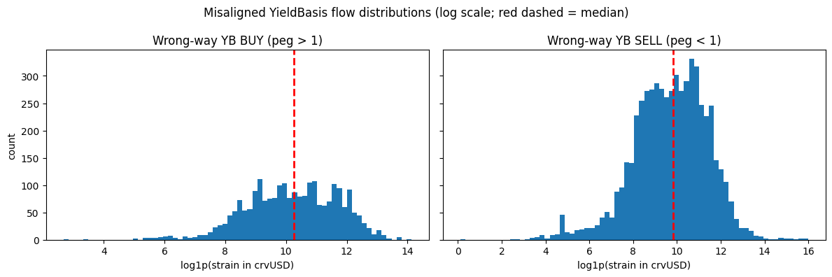 We construct histograms summarizing the distribution of misaligned YieldBasis flow sizes under different peg conditions. The horizontal axis shows flow magnitude, measured as log1p(strain in crvUSD) to place small and large flows on a common scale, while the vertical axis reports their frequency. The red dashed line denotes the median flow size for each distribution.