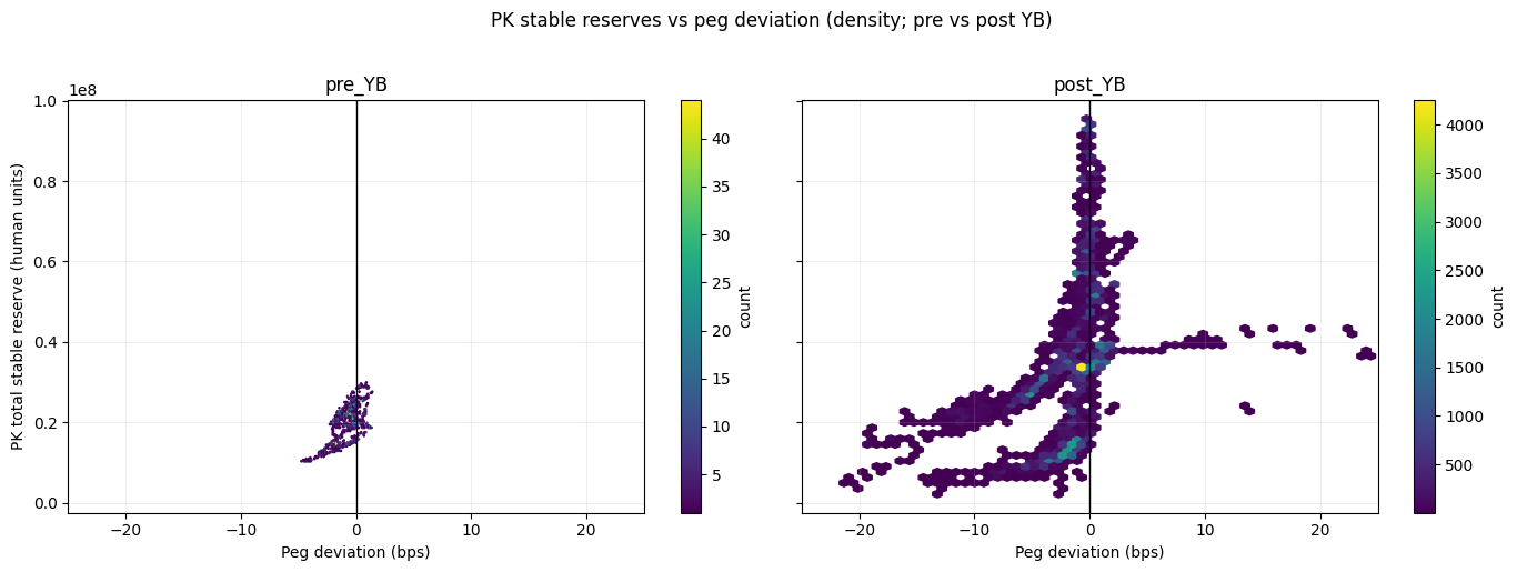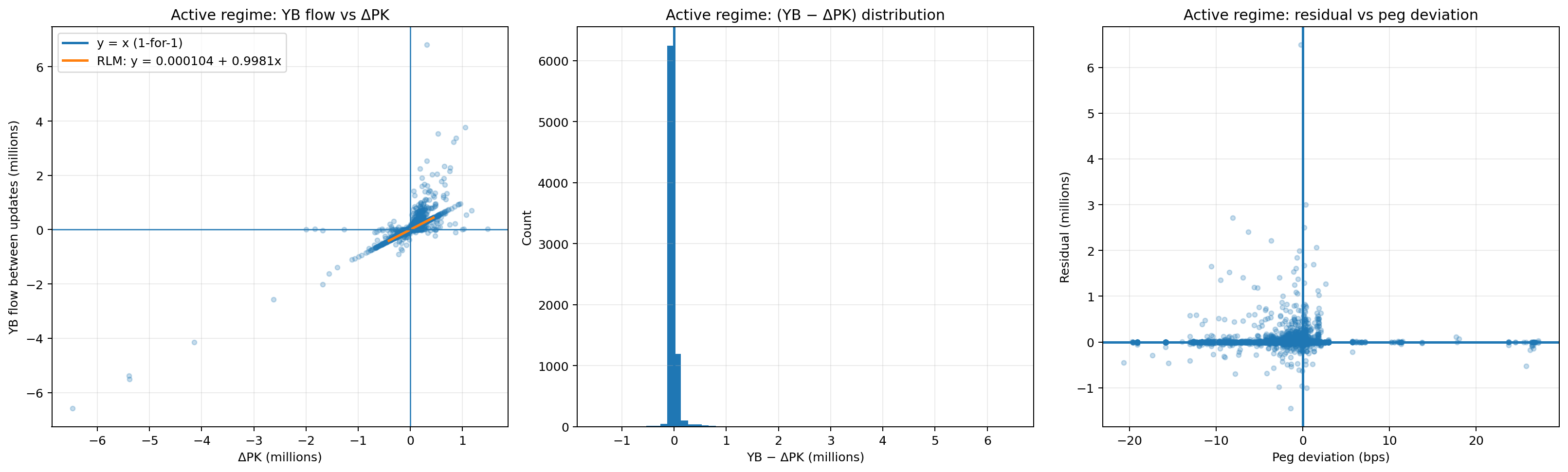 Finally, the right panel plots the remaining PK reserve changes after accounting for YB flows against peg deviation. The absence of any visible slope or structure, with points clustered around zero across the full range of peg deviations, shows that once YB activity is removed, there is no systematic peg-dependent pattern left.