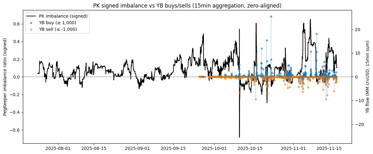 The chart below aggregates PegKeeper pool balances and YieldBasis trades into 15-minute intervals. PegKeeper imbalance is defined as ((\text{crvUSD} - \text{stable}) / (\text{crvUSD} + \text{stable})). YieldBasis buy and sell flows into PegKeeper pools are summed per interval, filtered to exclude trades below 1,000 crvUSD, and plotted to assess directional pressure relative to pool balance.