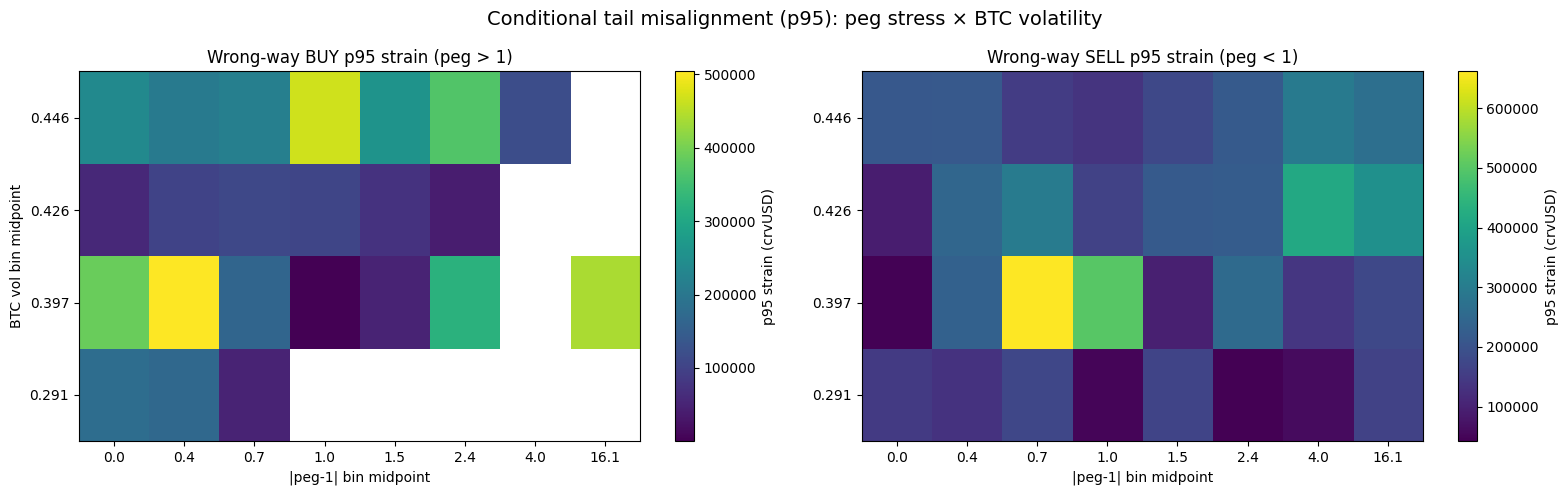 We next condition on peg deviation severity. Expressing wrong-way flows in basis points of peg deviation, we find that extreme (p95) misaligned YB activity rises as the peg moves further from parity and volatility increases.