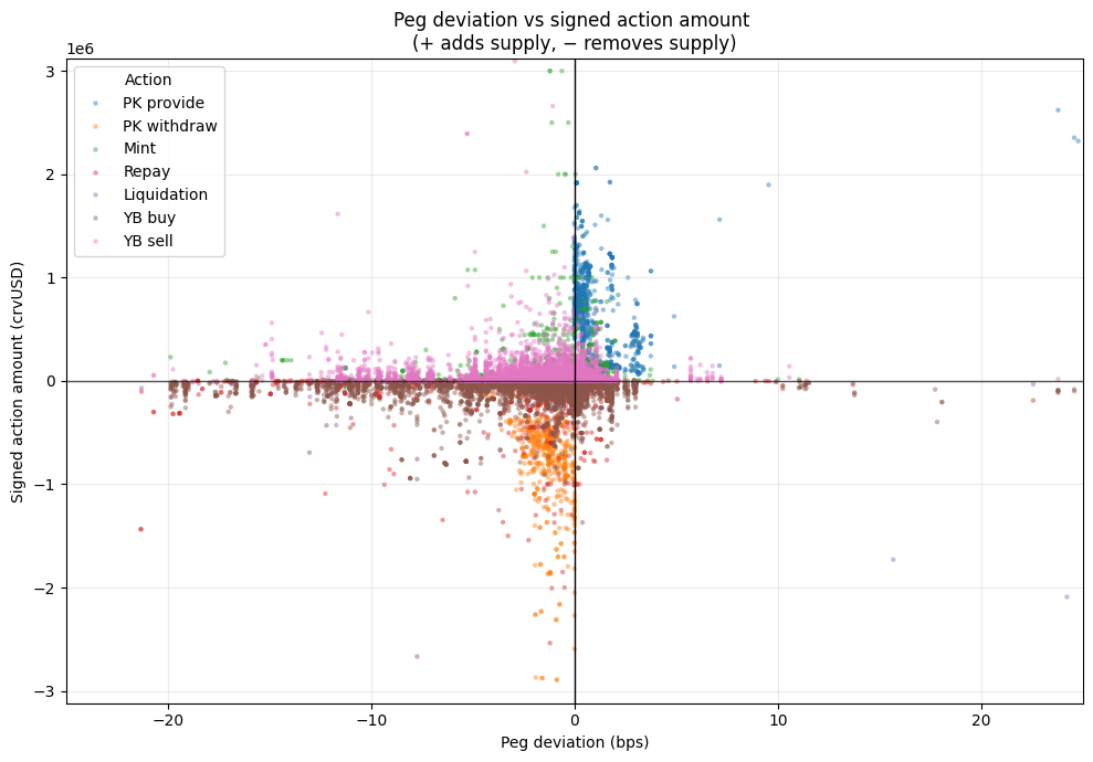 We plot peg deviation against signed action magnitude in a single four-quadrant scatter plot, with points colored by action type. This provides a non-parametric view of which actions occur, and in which direction, conditional on the peg being above or below parity. All figures use winsorized axis limits based on empirical quantiles to reduce the influence of extreme outliers.