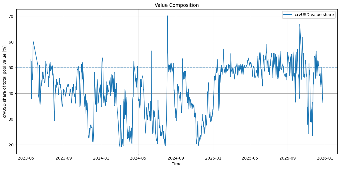 We observe that a ratio > 0 (indicating more crvUSD in the pool than the paired stablecoin) repeatedly reaches levels of ~0.6 over the observed timeframe, with the aggregated imbalance reaching as high as 30/70.