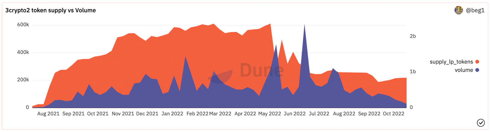 Furthermore, we can observe that the volatility in volume seems very correlated, with a little delay, to the volatility in total supply of LP token, thus, to the TVL. The correlation coefficient is also likely to be very high on the upside.