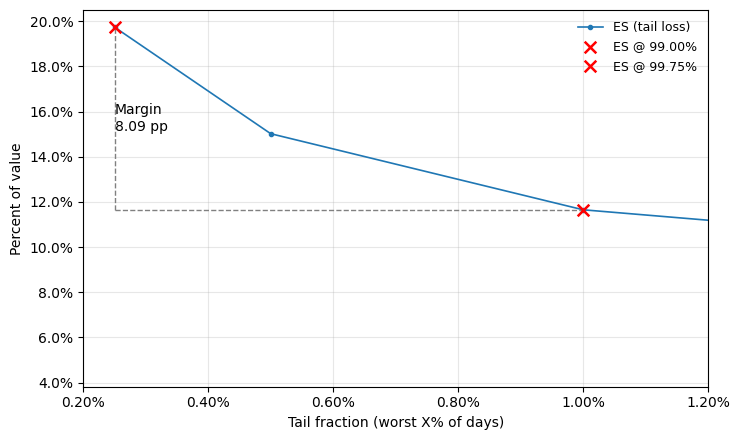 To study the margin requirement, we look at how the margin requirement changes by narrowing in on the worst sampled period (i.e., the top 10% of worst scenarios, the top 5% of worst scenarios, and so on). We take the difference between the worst 1% and the worst 0.25% as the margin requirement. We choose 0.25% for extra conservatism (where Margin M = ES99.75−ES99)
