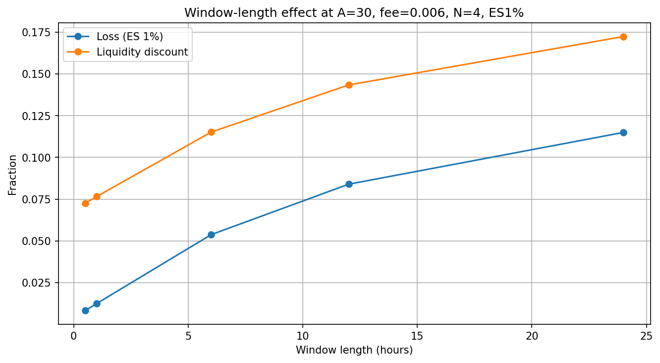 Using a short simulation window (e.g., 0.5h) to estimate tail loss (ES) systematically understates real overnight risk. This is because short windows capture fewer adverse swings. The measured tail loss is biased down, leading to an overly optimistic A, liquidation_discount, and loan_discount. In practical terms, what we are assuming if we simulate with a 30-minute window, is that the position is exposed for ~30 minutes before someone (user/bot/keeper/liquidator) can adjust, hedge, or liquidate.