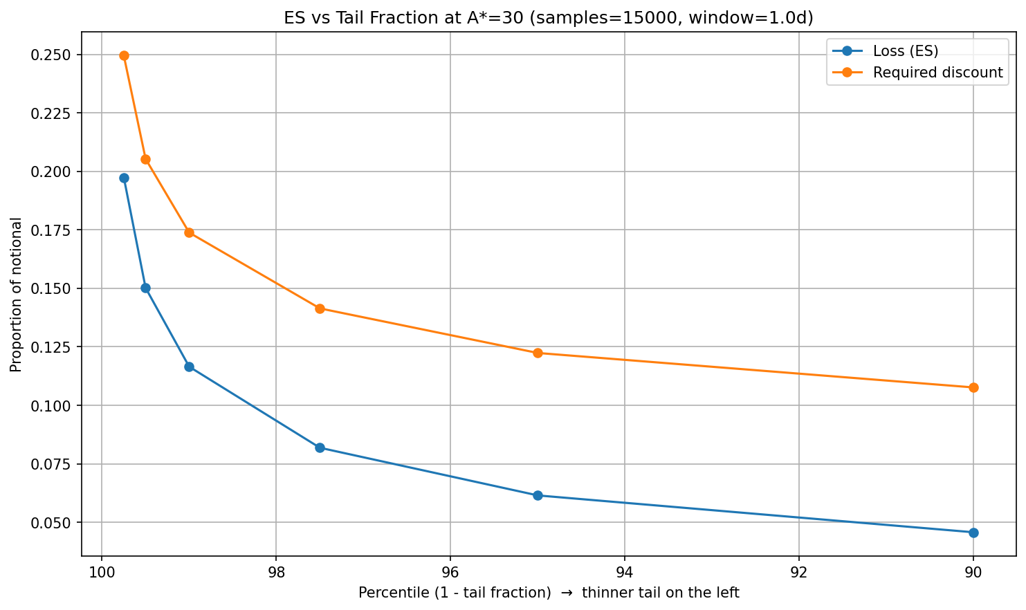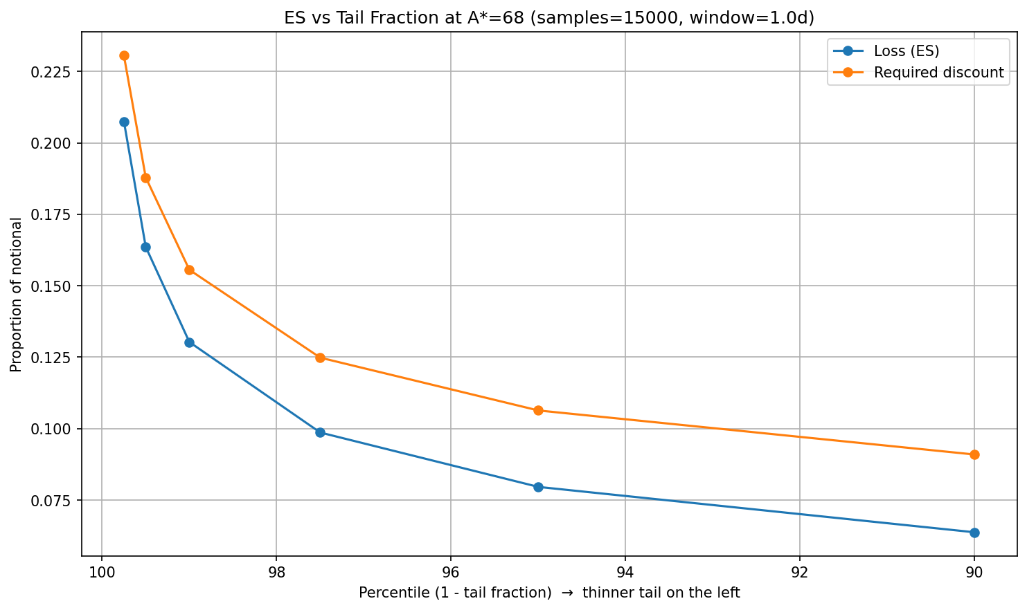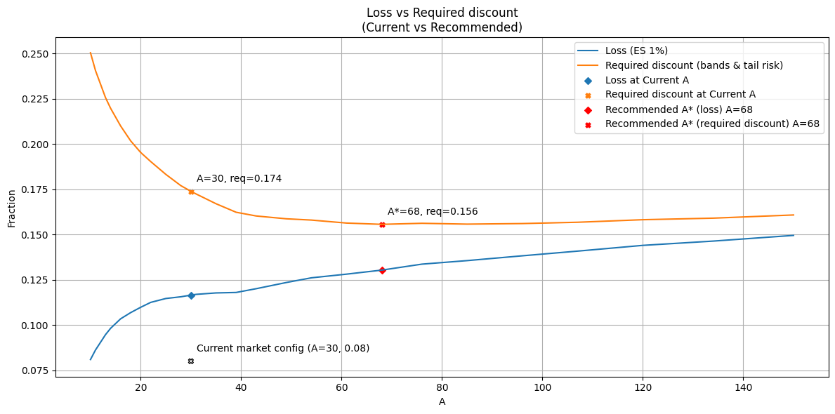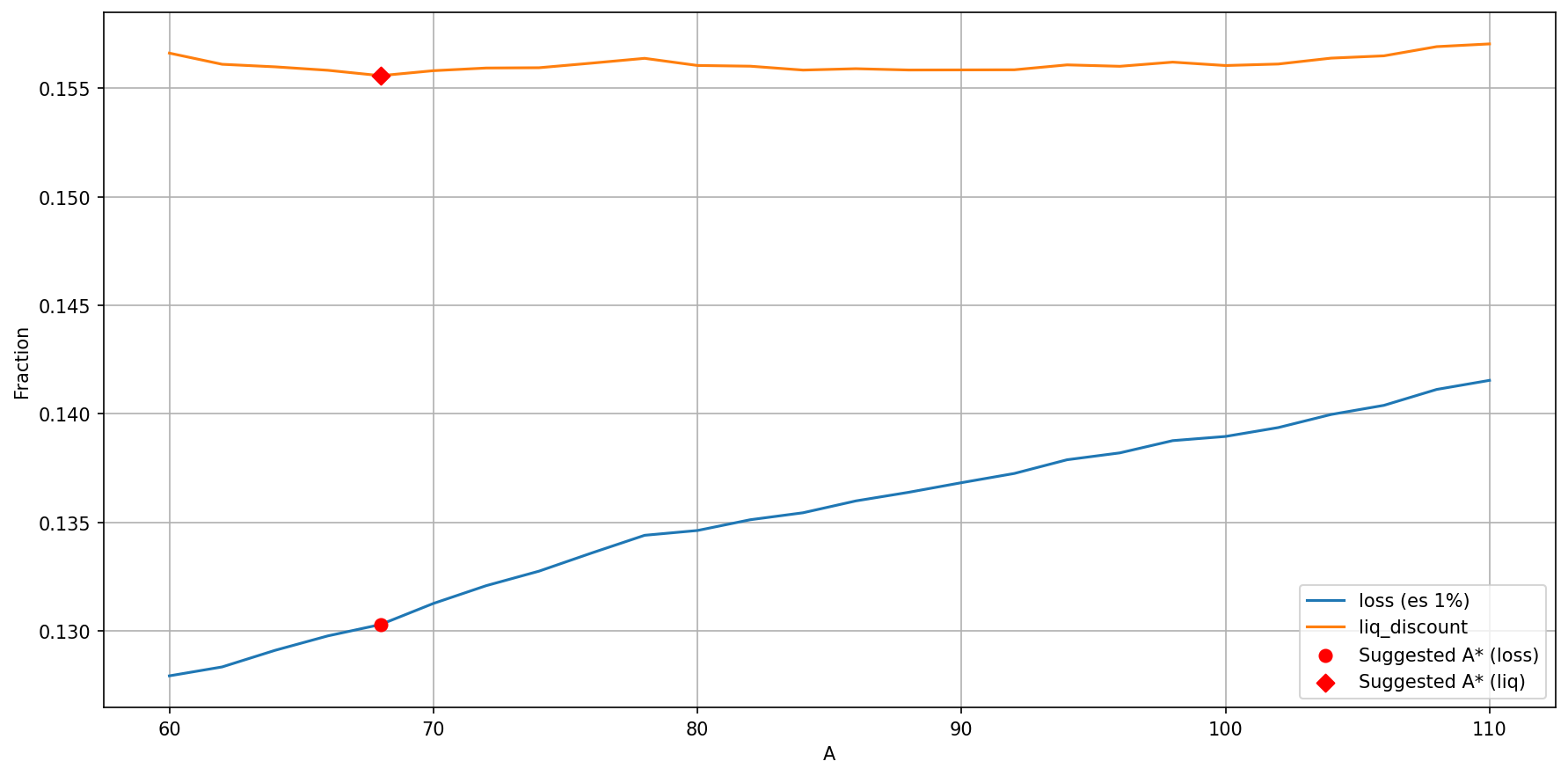 The zoomed sweep suggests A≈68 by the orange-min rule. Following the repo mapping, liquidation_discount would be the blue ES@1% at A=68, suggesting a value of 14% (~0.1303). Because we cannot change A in production (A=30 fixed), we instead propose liquidation_discount ≈ 12% (blue ES@1% at A=30).