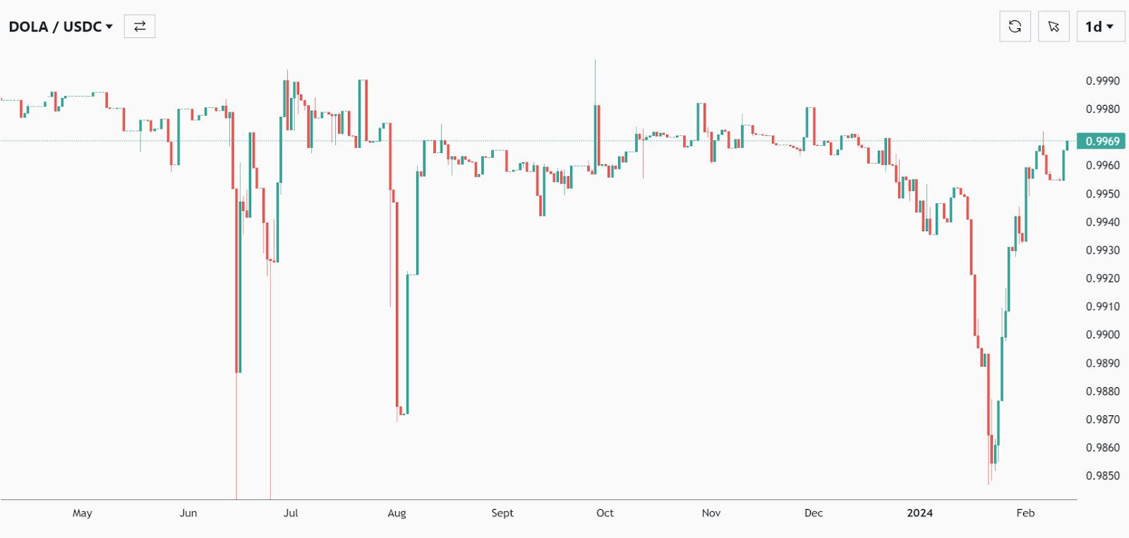 The DOLA stablecoin is soft pegged to $1, and like fully decentralized, over-collateralized stablecoins, can experience some volatility around this peg. Larger deviations (below $0.99) often recover fast due to the repegging mechanism built into the protocol (increasing borrowing cost on FiRM, AMM Fed contractions).