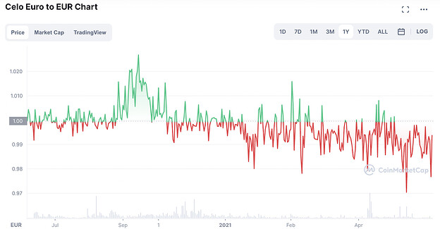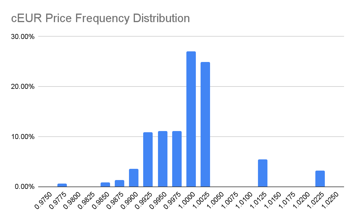 According to CoinMarketCap, since 29 June 2021 and until 4 July 2022, on a closing basis, cEUR was within +/-1.25% of the peg, 95% of the time and within +/-2.25% 99.7% of the time. cEUR withstood the market pressure caused by the collapse of UST; the on-chain stability mechanism Mento protocol immediately responded to excess supply around May 11, and remains within the peg as of the date of this proposal. Deviations from the peg are observed in relatively illiquid venues where small transaction sizes have a disproportionate impact on the price.