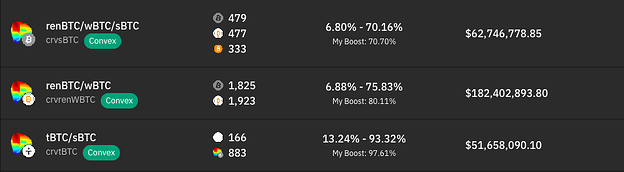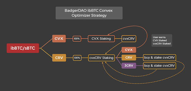 With that in mind, 3 of the 4 underlying vault tokens (CRV ren, sbtc and tbtc lp’s) that make up ibBTC have Curve/Convex optimizer strategies. Where 80% of all earned yield in the form of CRV or CVX is either held as veCRV (through Convex cvxCRV) or staked via CVX pool.