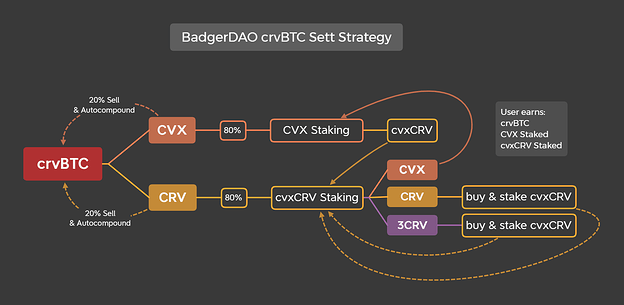 Here is a breakdown on how the bCrvRenWBTC, bCrvRenWSBTC and bCrvtBTC strategies work. After locking CRV via cvxCRV we are taking the rewards earned (CVX, CRV, 3CRV) and buying cvxCRV on the market to further support its peg and lock up even more CRV.