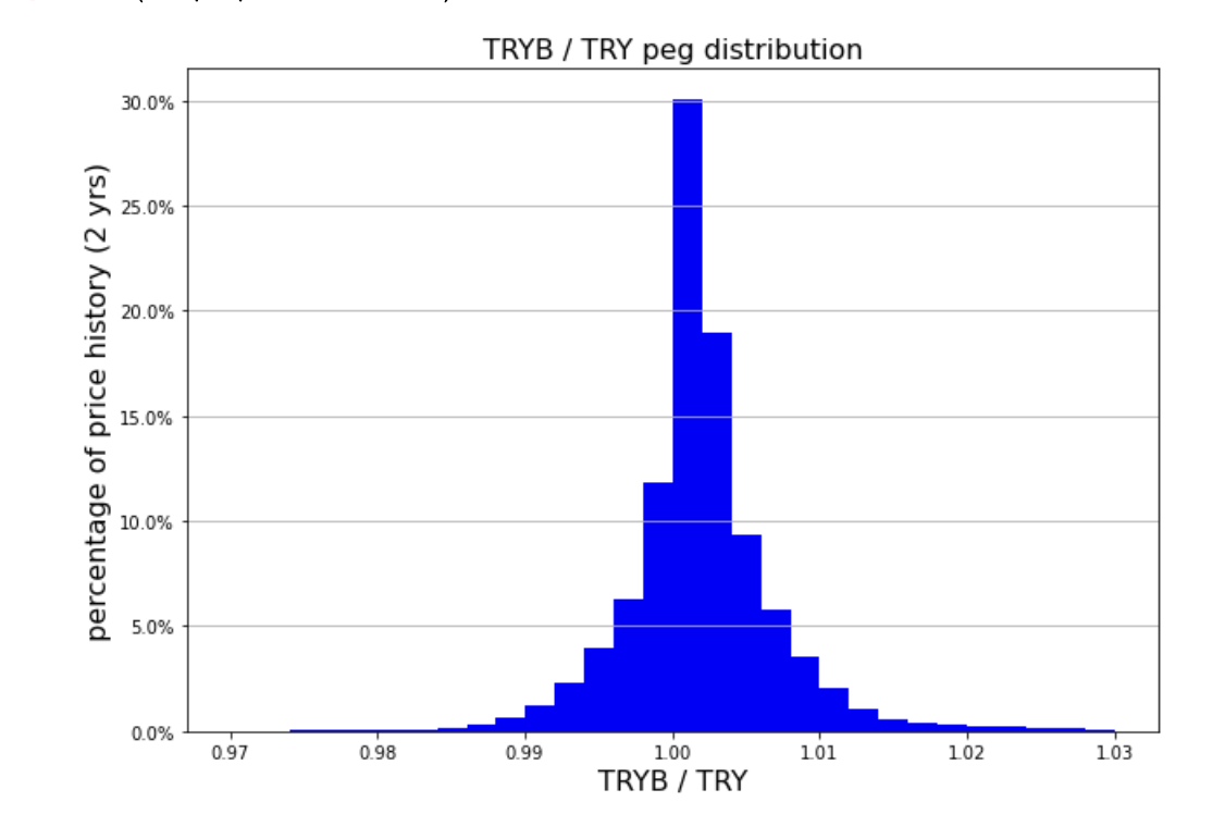 From August 2020 and up until 31 October 2022, TRYB was within +/-1% of the peg 93.14% of the time and within +/-2% 98.90% of the time.