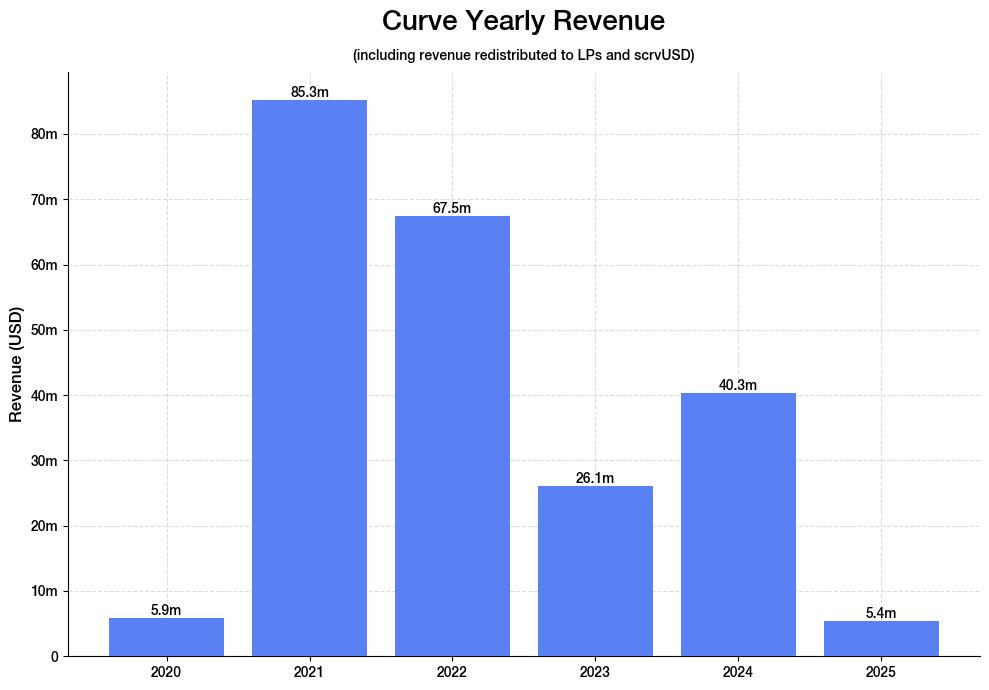 While Curve’s revenue fluctuates with the fortunes of the crypto market, the protocol generated over $40m in fees in 2024. Fees for the first two months of 2025 amount to ~$5.4m, which, with a crude projection, should get us above $35m this year. A typical startup’s operating expenses account for 60 to 90% of revenue, for Curve it is only about 10%. The protocol is lean, but is also underspending on sustaining its growth.
