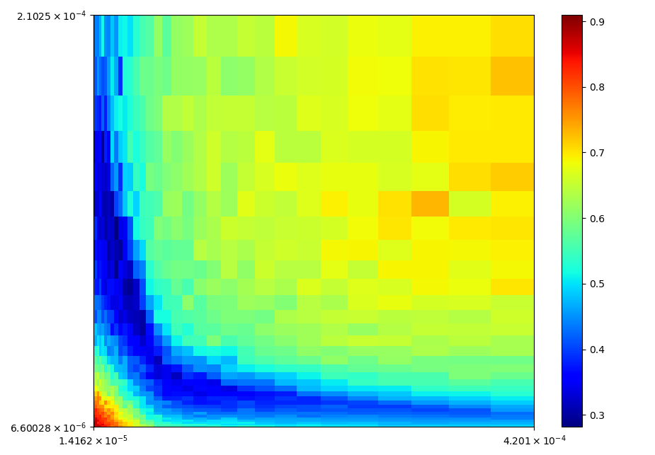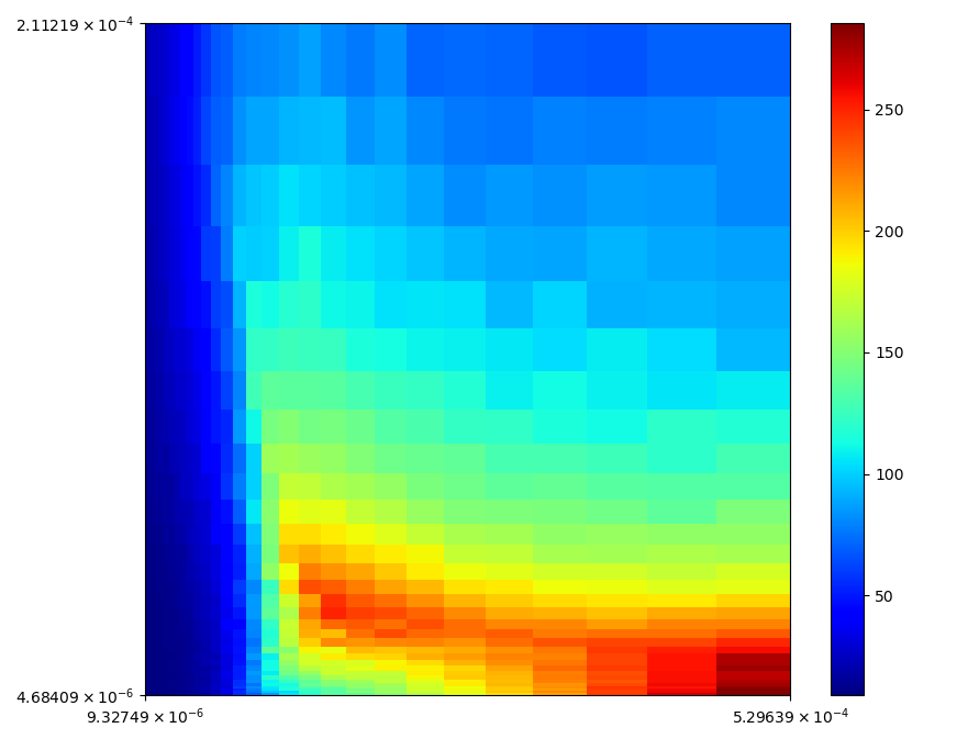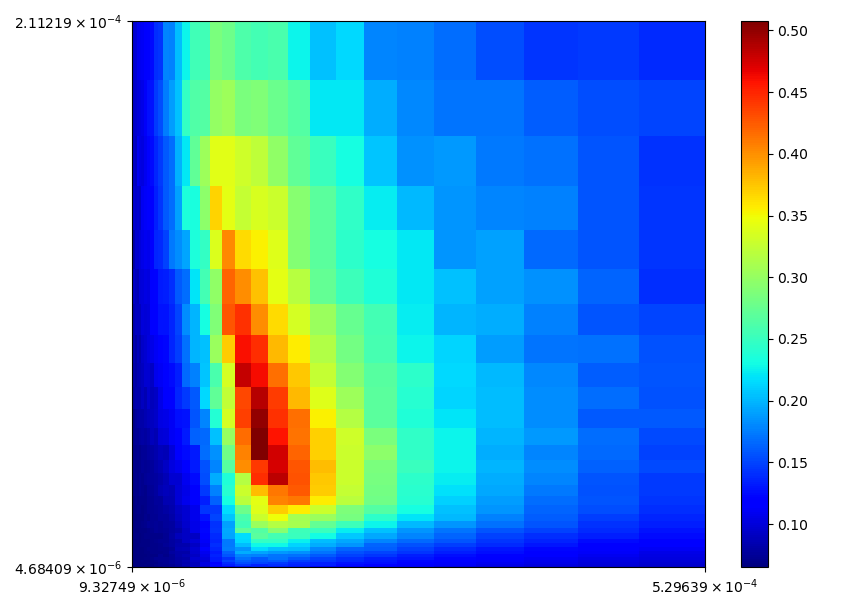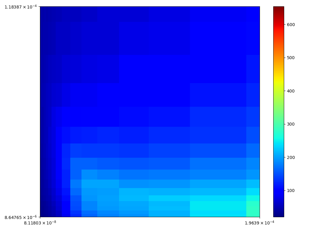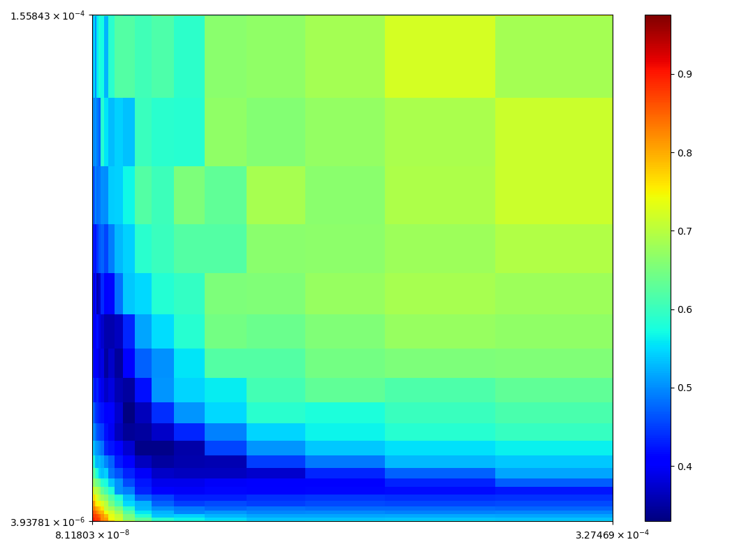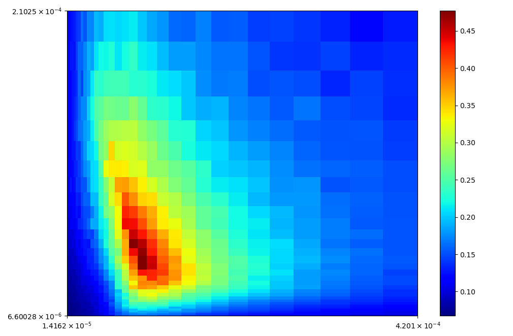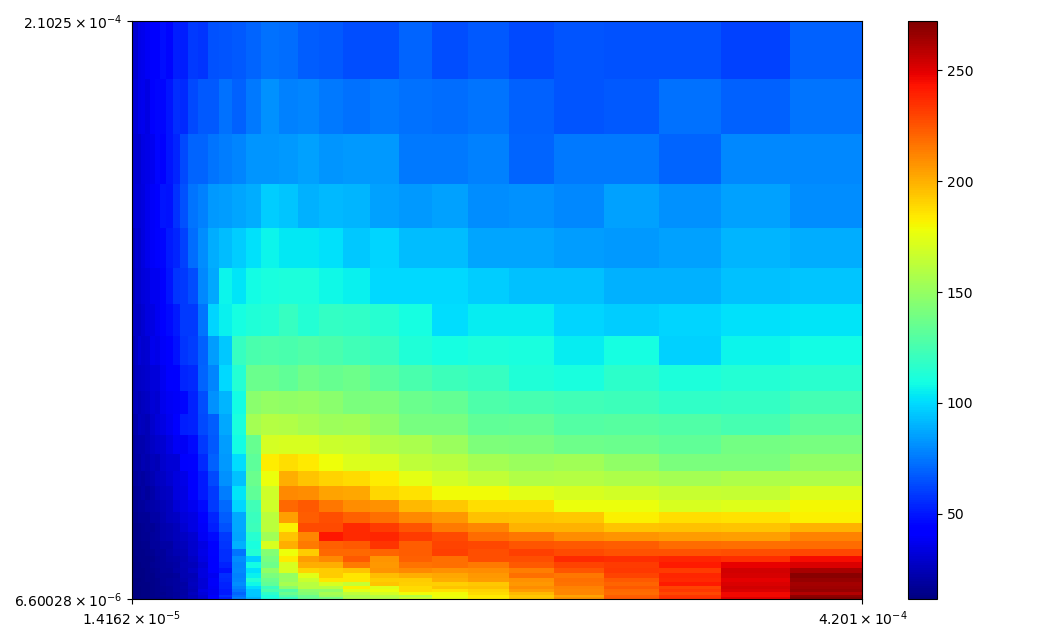 Idea appeared rather simple. We set amplification fixed (say A=10) as well as mid_fee and out_fee. Here I chose mid_fee = 0.03%, and out_fee varied from 0.8% to 5.0% in different simulations. For each value of out_fee I performed a 2D scan (fee_gamma, gamma). The parameter fee_gamma is responsible for the steepness of dynamic fee function, and gamma is responsible for the width of the concentrated liquidity part of the liquidity distribution.