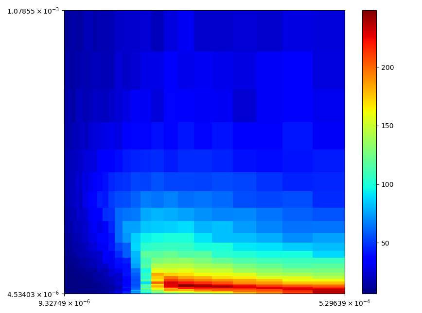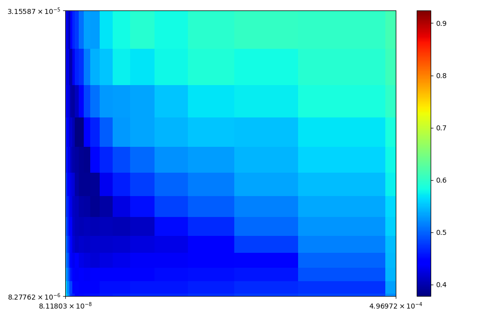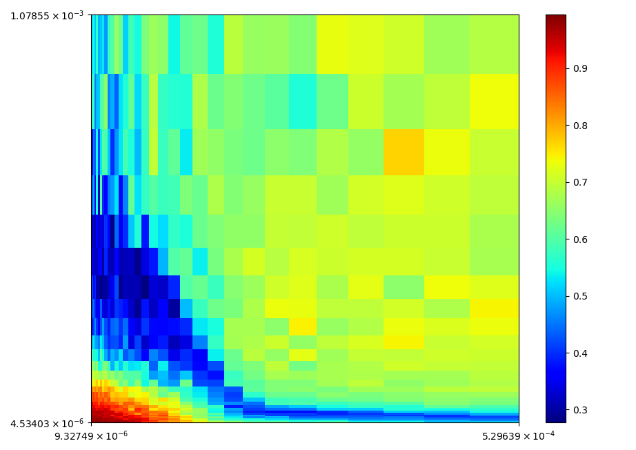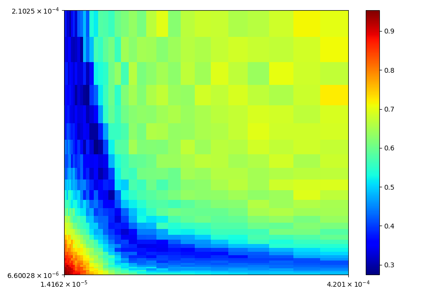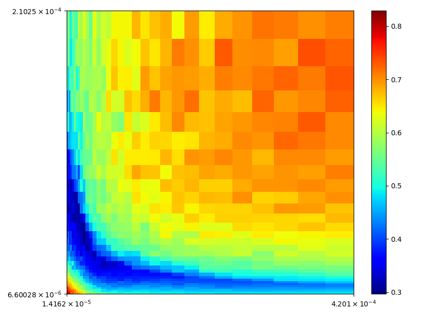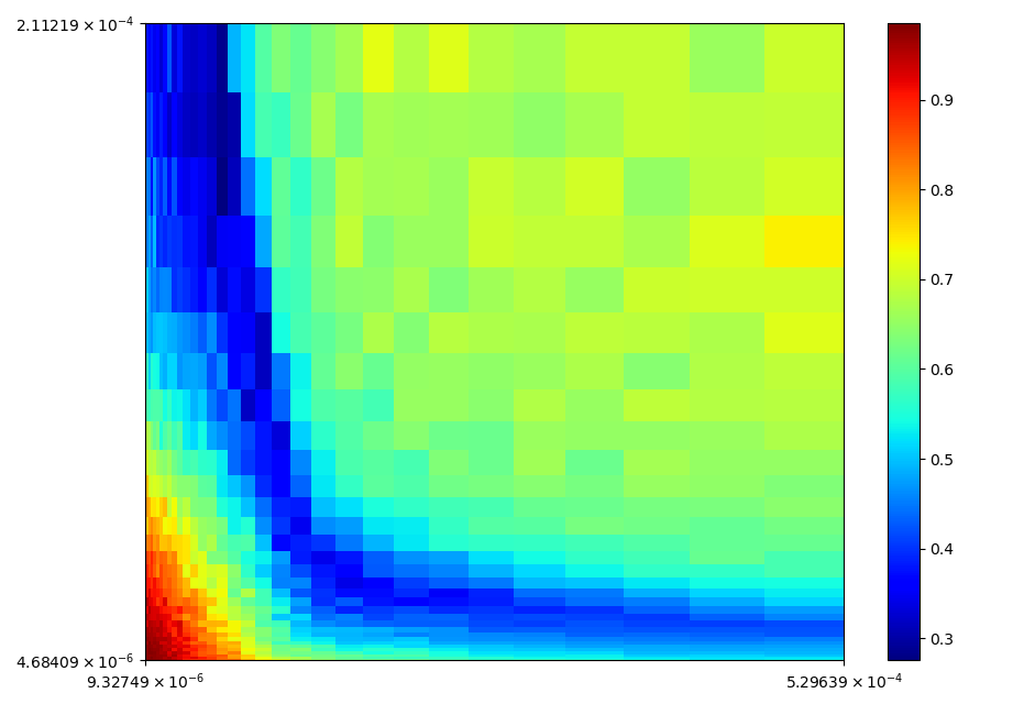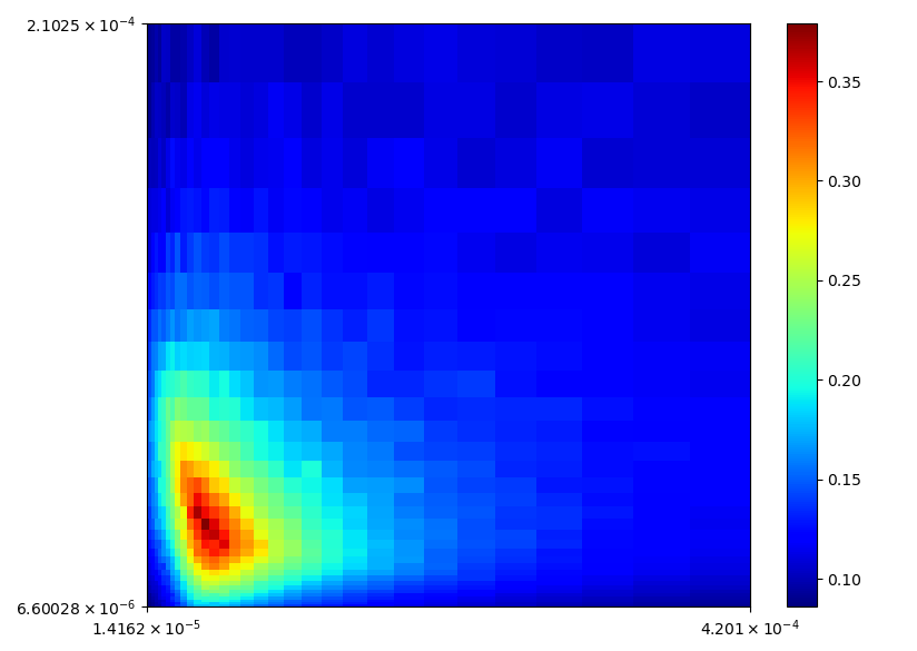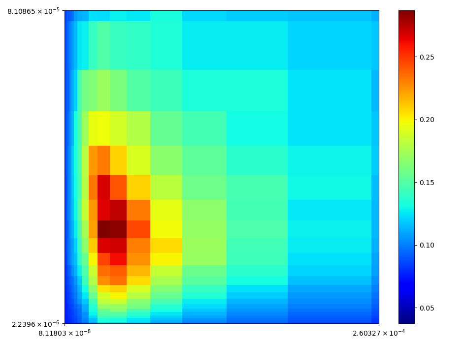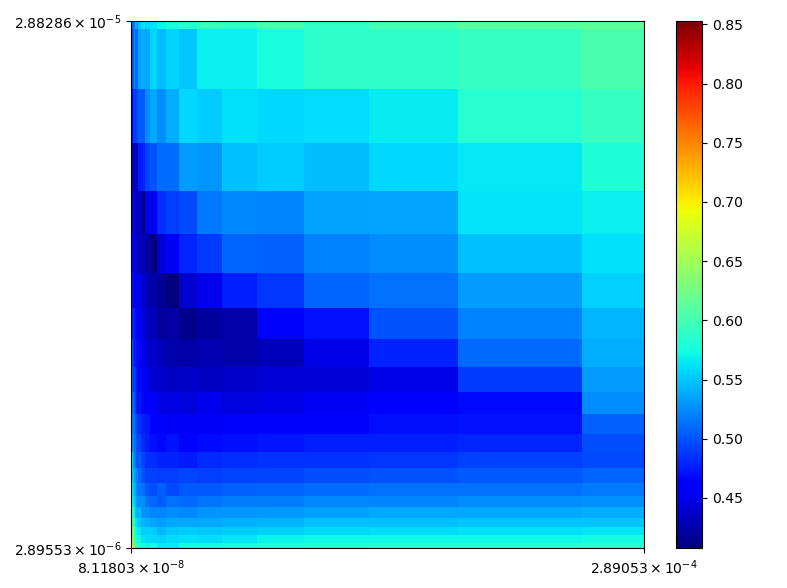 Idea appeared rather simple. We set amplification fixed (say A=10) as well as mid_fee and out_fee. Here I chose mid_fee = 0.03%, and out_fee varied from 0.8% to 5.0% in different simulations. For each value of out_fee I performed a 2D scan (fee_gamma, gamma). The parameter fee_gamma is responsible for the steepness of dynamic fee function, and gamma is responsible for the width of the concentrated liquidity part of the liquidity distribution.
