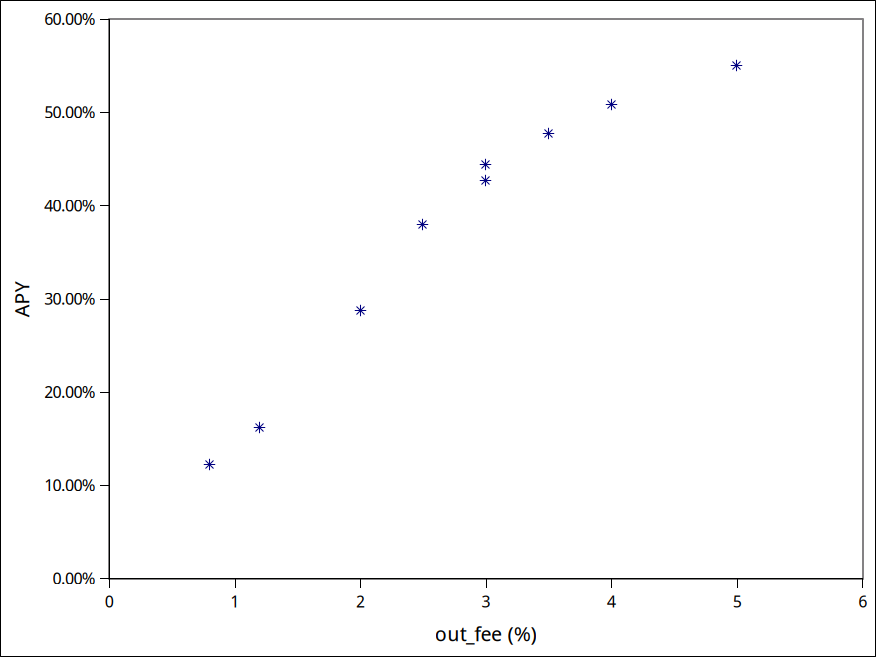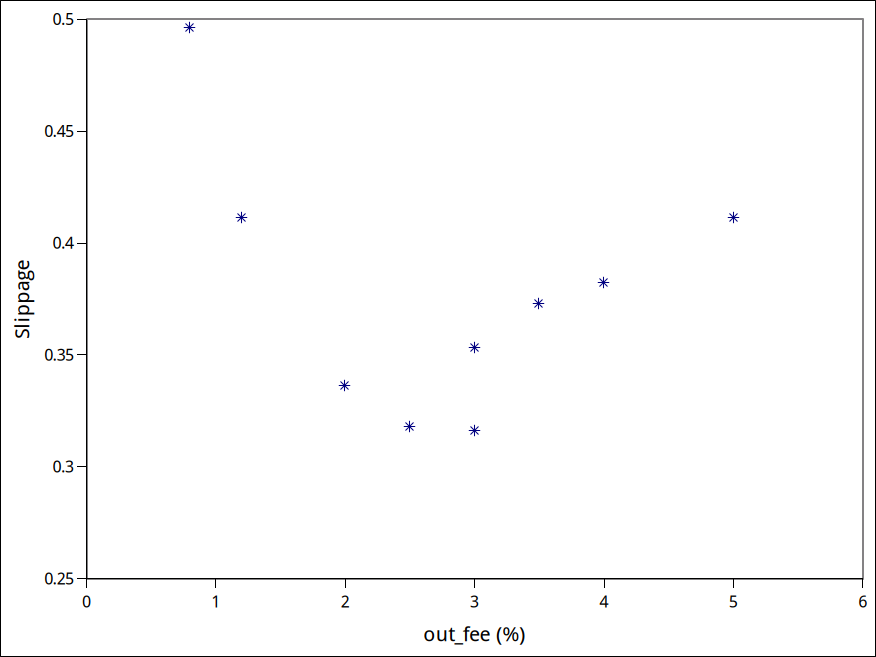 In each of the scans, we find maximum APY, and keep track of volume and average slippage in the point of maximum APY. We are looking for the maximum of volume / minimum of slippage in those points of maximum APY as we scan out_fee.