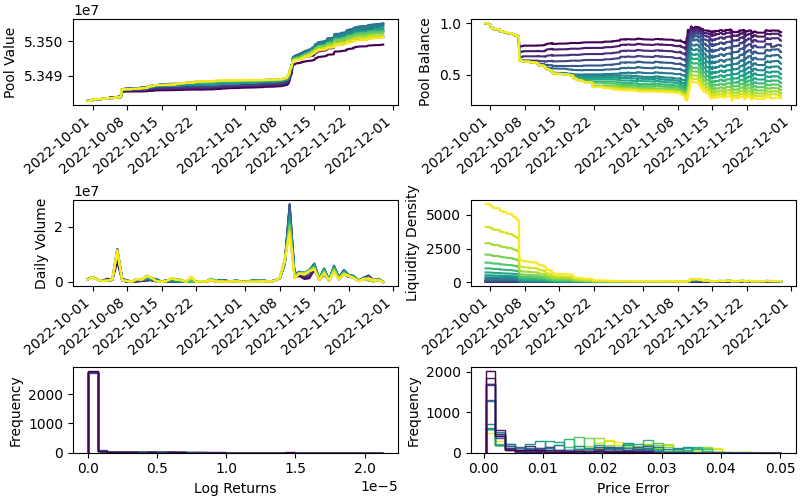 This seems reasonable. With 2 bps fee, returns are maximized with that A value. There’s some pool imbalance risk, but it’s not too far outside the goal range (i.e., we might expect up to ~8 percentage point deviation from the optimal 25/25/25/25% balance).